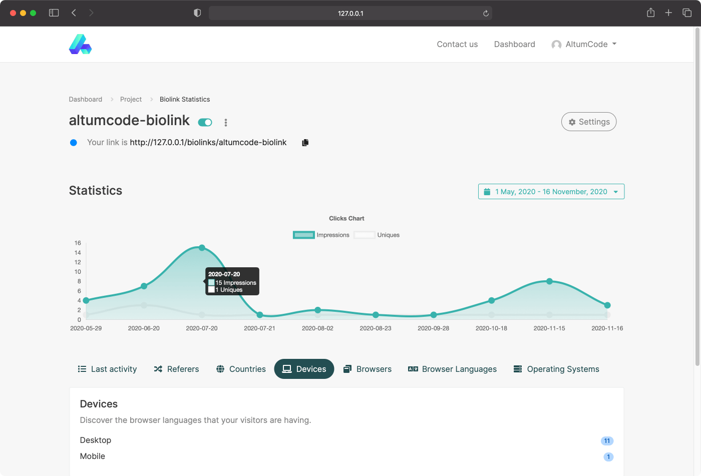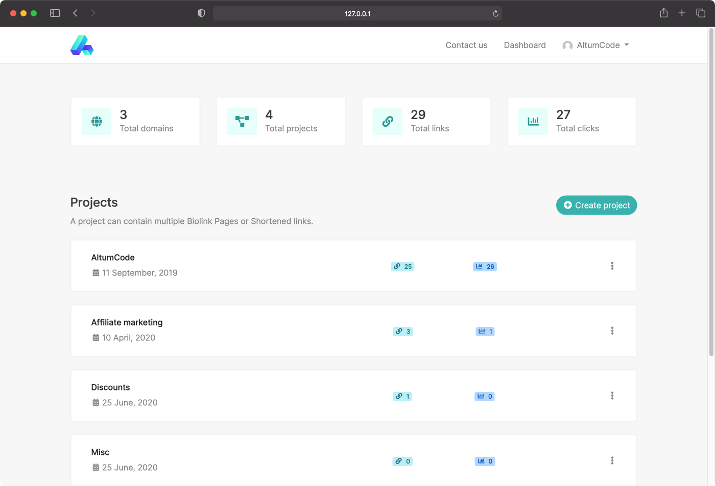 Create shortened URLs, unique biolink pages and get proper analytics of your visitors.